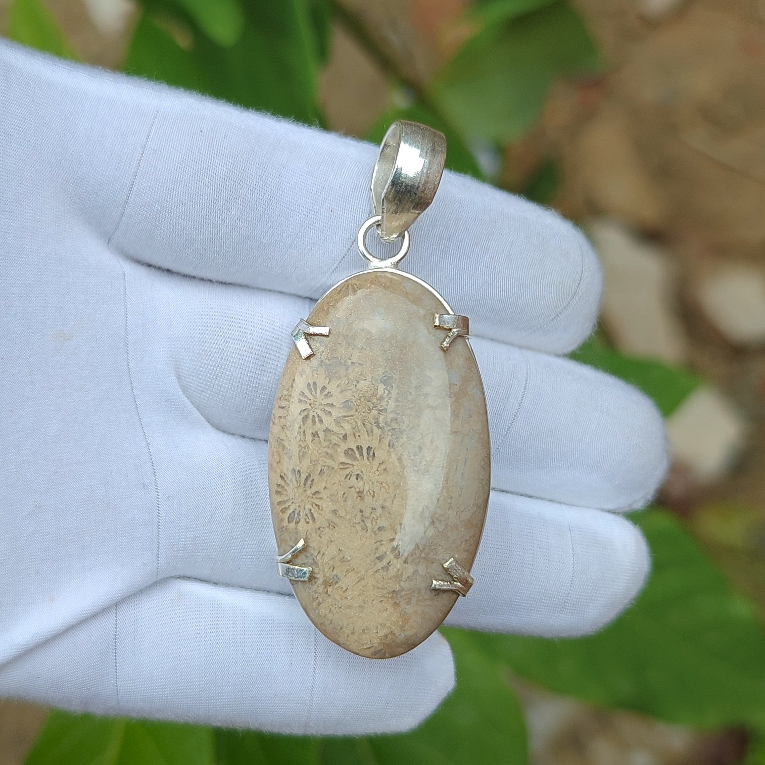 Original price was: ₹2,000.00.₹1,000.00Current price is: ₹1,000.00.Fossil Coral Pendant: Oval Grey Gemstone, 925 Sterling Silver Plated Pendant